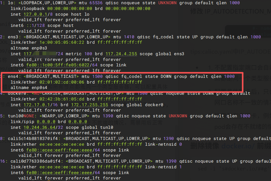 - 如果存在多网卡,例如ens3,ens4,但是ens4显示的是内网地址时,calico—pod会存在不就绪的情况,需禁用后正常。